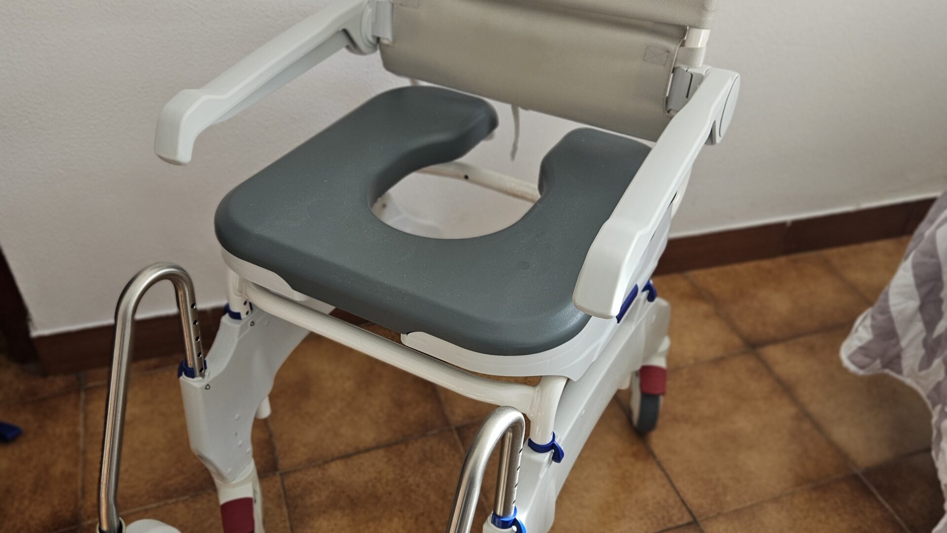 Se vende SILLA Aseo. Modelo: AQUATEC OCEAN ERGO con chasis de acero inoxidable, ruedas pequeñas, reposapiés plegables, respaldo de nylon. Max. 150kg.