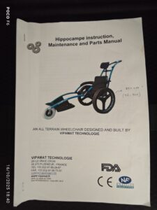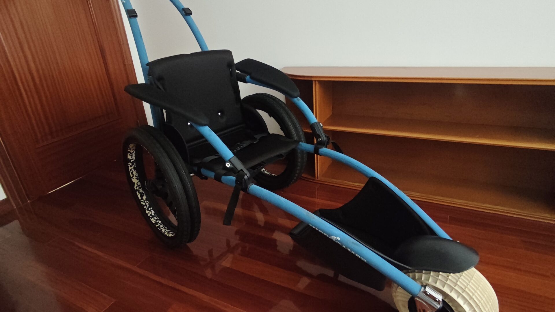 Silla de ruedas autopropulsada para playa y todoterreno. Aunque nunca ha sido usada, el recubrimiento de goma azul presenta alguna pequeña zona de desgaste por el paso del tiempo. El chasis y las ruedas están en perfecto estado.