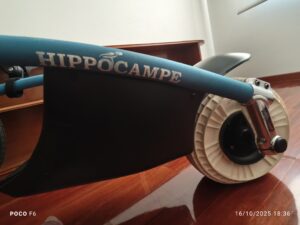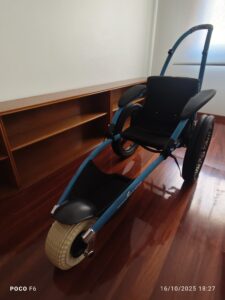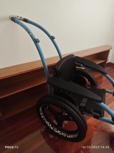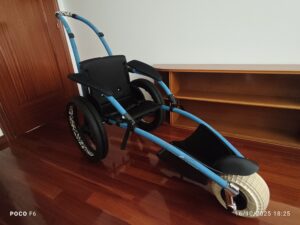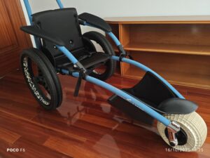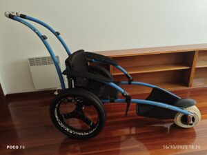 Silla de ruedas autopropulsada para playa y todoterreno. Aunque nunca ha sido usada, el recubrimiento de goma azul presenta alguna pequeña zona de desgaste por el paso del tiempo. El chasis y las ruedas están en perfecto estado.